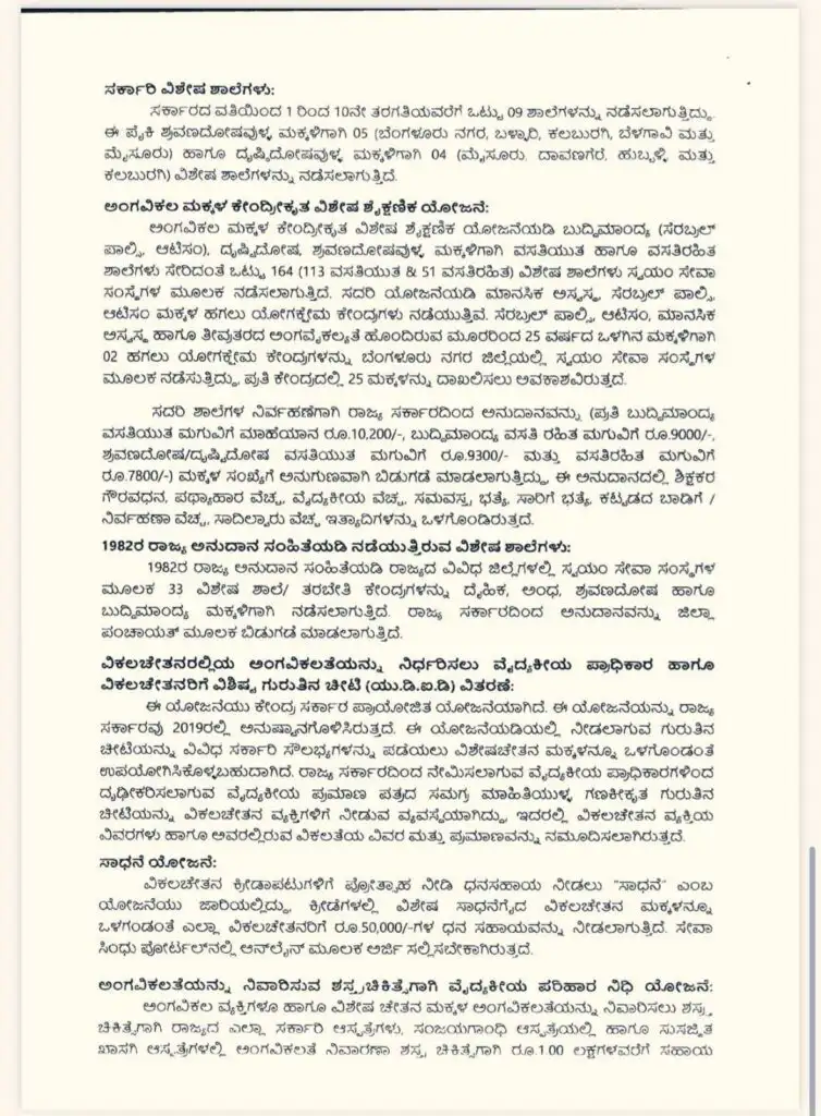 ಅಂಗವಿಕಲ ಮಕ್ಕಳ ಕೇಂದ್ರೀಕೃತ ವಿಶೇಷ ಶೈಕ್ಷಣಿಕ ಯೋಜನೆಯಡಿ ಬುದ್ಧಿಮಾಂದ್ಯ (ಸೆರಬ್ರಲ್ ಪಾಲ್ಸಿ, ಆಟಿಸಂ), ದೃಷ್ಟಿದೋಷ, ಶ್ರವಣದೋಷವುಳ್ಳ ಮಕ್ಕಳಿಗಾಗಿ ವಸತಿಯುತ ಹಾಗೂ ವಸತಿರಹಿತ ಶಾಲೆಗಳು ಸೇರಿದಂತೆ ಒಟ್ಟು 164 (113 ವಸತಿಯುತ & 51 ವಸತಿರಹಿತ) ವಿಶೇಷ ಶಾಲೆಗಳು ಸ್ವಯಂ ಸೇವಾ ಸಂಸ್ಥೆಗಳ ಮೂಲಕ ನಡೆಸಲಾಗುತ್ತಿದೆ. ಸದರಿ ಯೋಜನೆಯಡಿ ಮಾನಸಿಕ ಅಸ್ವಸ್ಥ, ಸೆರಬ್ರಲ್ ಪಾಲ್ಸಿ, ಆಟಿಸಂ ಮಕ್ಕಳ ಹಗಲು ಯೋಗಕ್ಷೇಮ ಕೇಂದ್ರಗಳು ನಡೆಯುತ್ತಿವೆ. ಸೆರಬ್ರಲ್ ಪಾಲ್ಸಿ, ಆಟಿಸಂ, ಮಾನಸಿಕ ಅಸ್ವಸ್ಥ ಹಾಗೂ ತೀವ್ರತರದ ಅಂಗವೈಕಲ್ಯತೆ ಹೊಂದಿರುವ ಮೂರರಿಂದ 25 ವರ್ಷದ ಒಳಗಿನ ಮಕ್ಕಳಿಗಾಗಿ 02 ಹಗಲು ಯೋಗಕ್ಷೇಮ ಕೇಂದ್ರಗಳನ್ನು ಬೆಂಗಳೂರು ನಗರ ಜಿಲ್ಲೆಯಲ್ಲಿ ಸ್ವಯಂ ಸೇವಾ ಸಂಸ್ಥೆಗಳ ಮೂಲಕ ನಡೆಸುತ್ತಿದ್ದು ಪ್ರತಿ ಕೇಂದ್ರದಲ್ಲಿ 25 ಮಕ್ಕಳನ್ನು ದಾಖಲಿಸಲು ಅವಕಾಶವಿರುತ್ತದೆ.