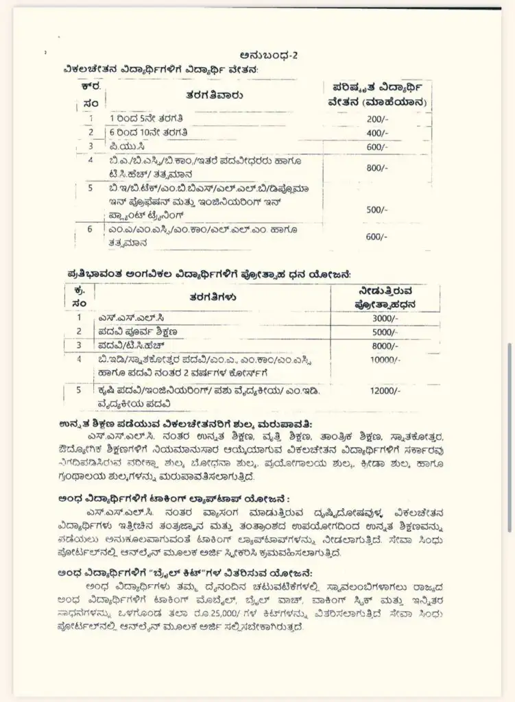 ಅಂಧ ವಿದ್ಯಾರ್ಥಿಗಳು ತಮ್ಮ ದೈನಂದಿನ ಚಟುವಟಿಕೆಗಳಲ್ಲಿ ಸ್ವಾವಲಂಬಿಗಳಾಗಲು ರಾಜ್ಯದ ಅಂಧ ವಿದ್ಯಾರ್ಥಿಗಳಿಗೆ ಟಾಕಿಂಗ್ ಮೊಬೈಲ್, ಬೈಲ್ ವಾಚ್, ವಾಕಿಂಗ್ ಸ್ಟಿಕ್ ಮತ್ತು ಇನ್ನಿತರ ಸಾಧನೆಗಳನ್ನು ಒಳಗೊಂಡ ತಲಾ ರೂ 25,000/ ಗಳ ಕಿಟ್ ಗಳನ್ನು ವಿತರಿಸಲಾಗುತ್ತಿದೆ ಸೇವಾ ಸಿಂಧು ಪೋರ್ಟಲ್ನಲ್ಲಿ ಆನ್ಲೈನ್ ಮೂಲಕ ಅರ್ಜಿ ಸಲ್ಲಿಸಬೇಕಾಗಿರುತ್ತದೆ